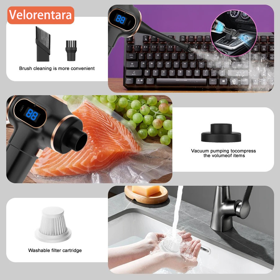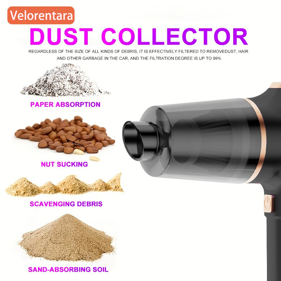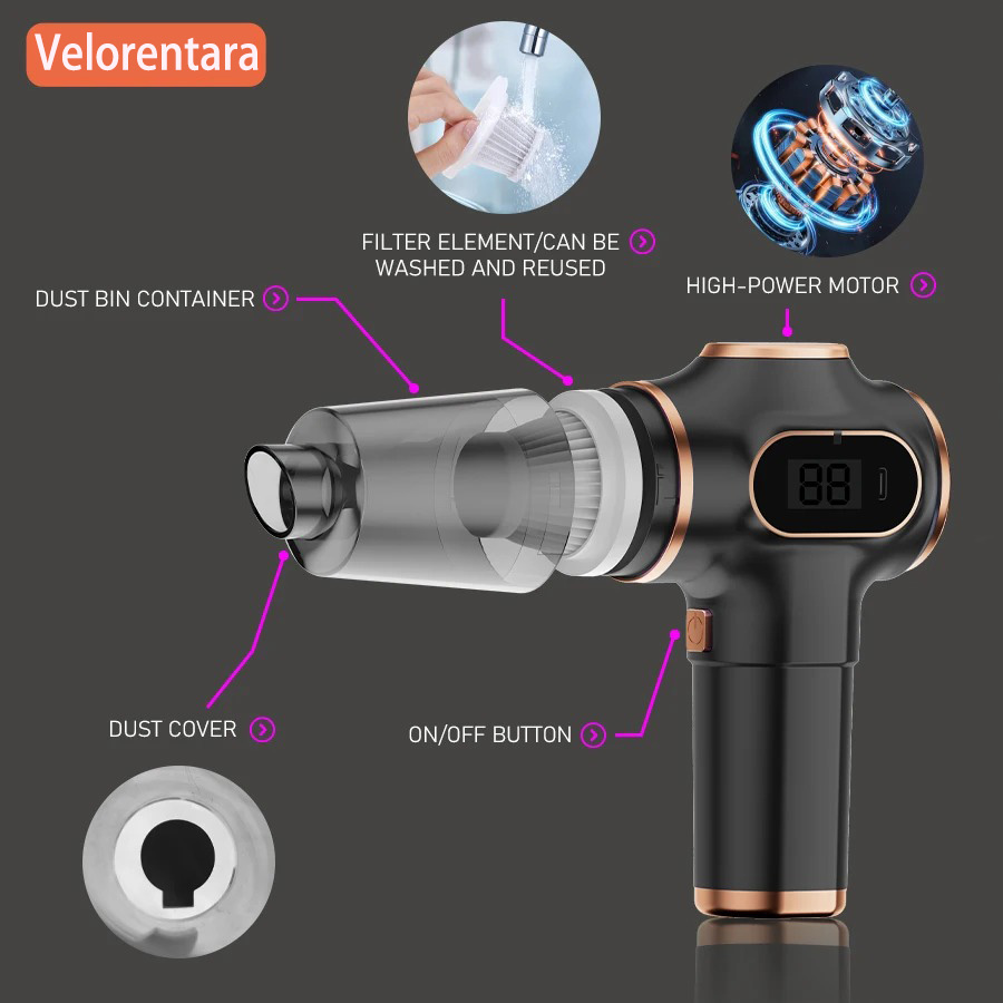 vacuum’s front and rear. This portable car vacuum also comes with various detachable nozzle accessories, perfect for deep cleaning your car, computer, sofa, and windows.